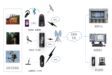 电力作业现场安全综合管控平台包括前端视频采集系统、管控平台服务端系统、监控现场桌面PC/手机APP客户端、4G/有线通信网络等几个部分